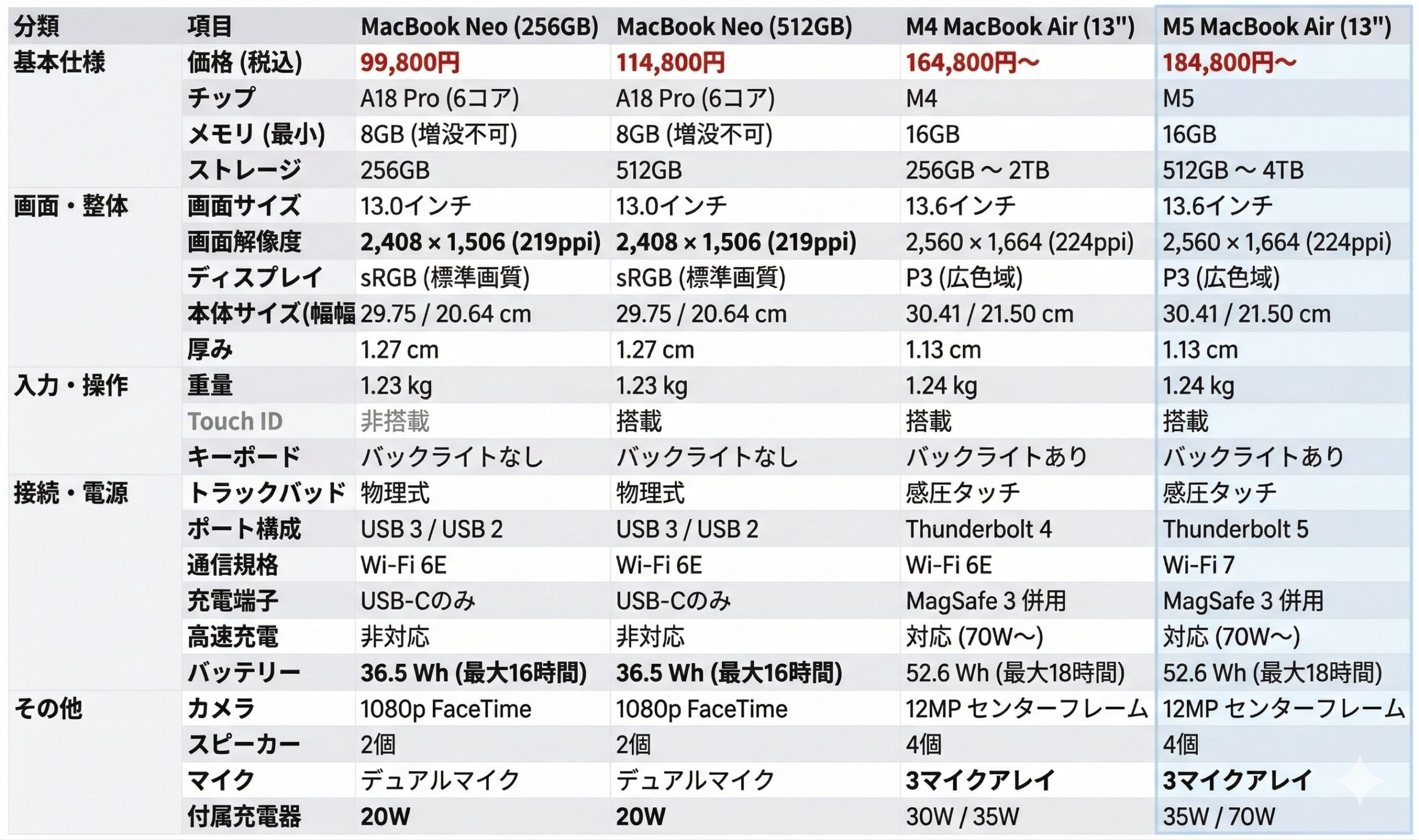 まずは結論からということで、最新のMacBook Neoと、王道のM4 / M5 MacBook Airの違いをパッと見でわかる表にまとめてみました。